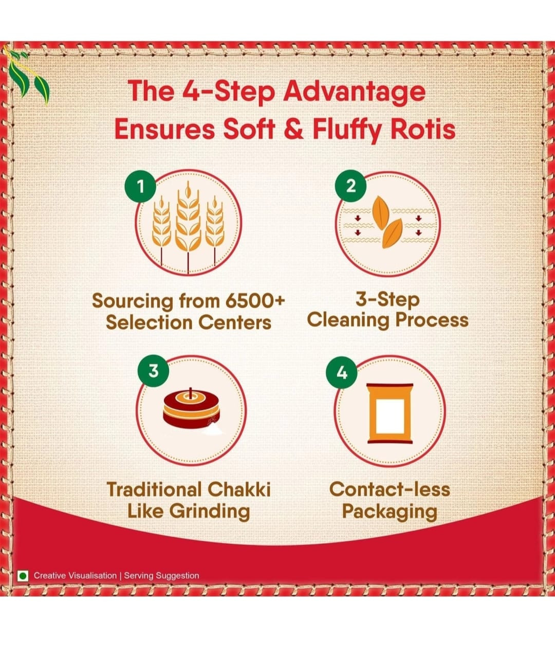Aashirvaad Shudh Chakki Atta is India's No. 1 atta brand. The 4-step advantage process of sourcing, cleaning, grinding & no-touch packaging ensures zero human contact. 100% pure whole wheat atta with all its natural dietary fibres intact. Sourced from a wide network of rural farmers, it is Made in India. The grains go through a 3-step cleaning process & �chakki-grinding� which ensures it contains 100% Sampoorna Atta & 0% Maida. The locked-in dietary fibres & nutrients help improve digestion & immunity. The dough absorbs more water keeping the rotis soft for a longer period. Aashirvaad Shudh Chakki Atta is made using the 4-step advantage process of sourcing, cleaning, grinding & contactless packaging Wheat is sourced from 6500+ selection centers across India Wheat grains are cleaned thrice The chakki-grinding process ensures it contains 0% Maida and 100% Sampoorna Atta The atta remains untouched because of the mechanised packaging Aashirvaad Shudh Chakki Atta is India's No.1 Atta Brand
