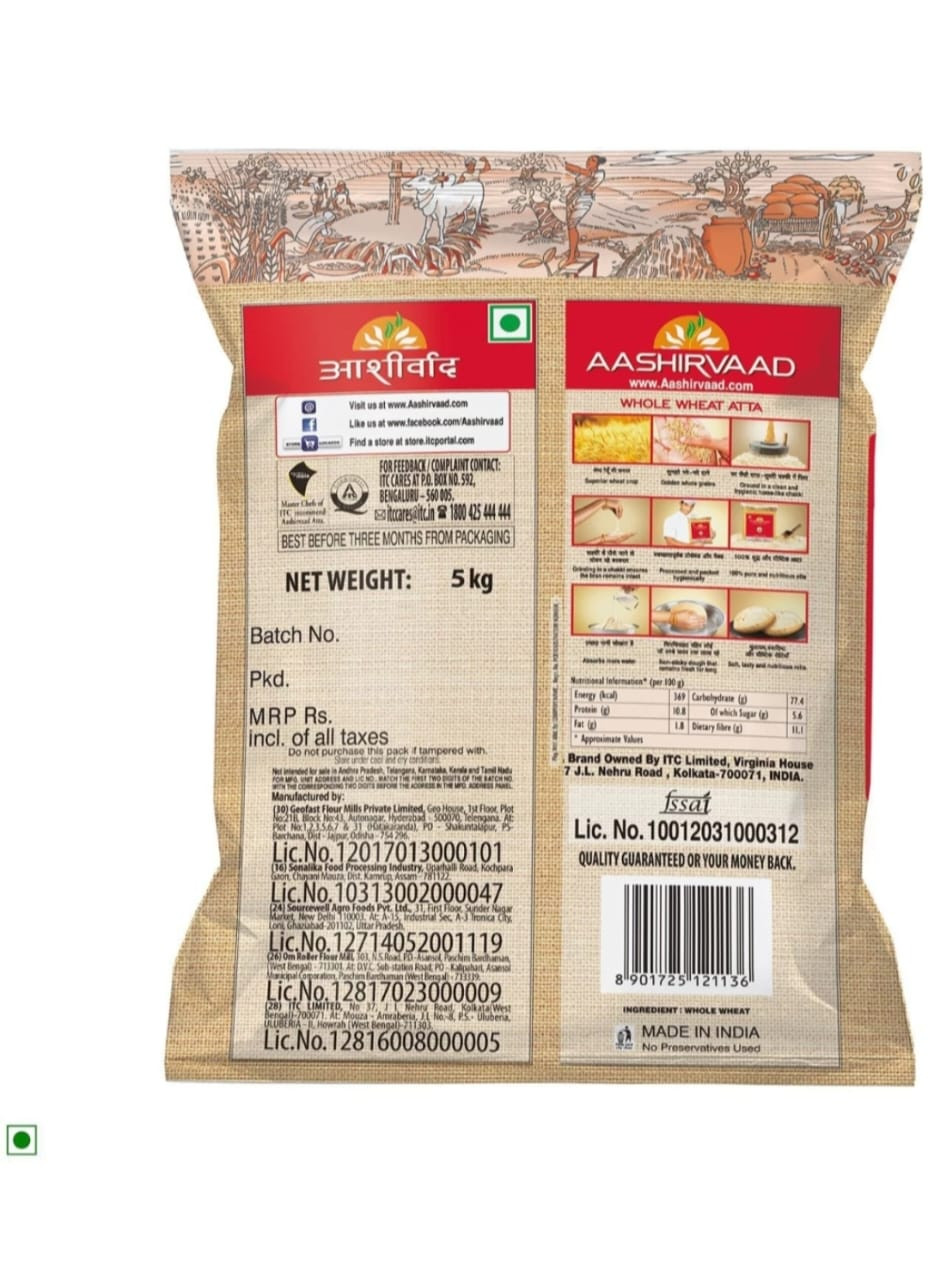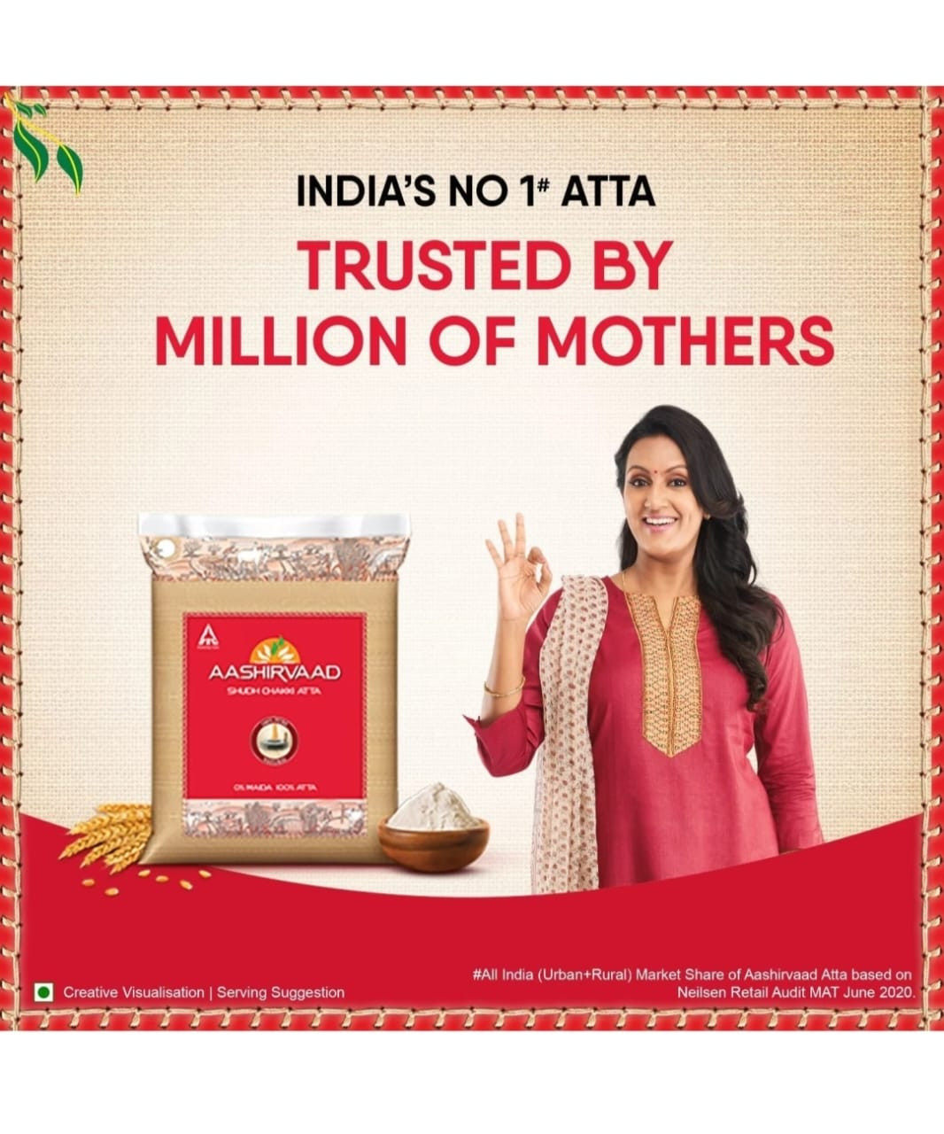 Aashirvaad Shudh Chakki Atta is India's No. 1 atta brand. The 4-step advantage process of sourcing, cleaning, grinding & no-touch packaging ensures zero human contact. 100% pure whole wheat atta with all its natural dietary fibres intact. Sourced from a wide network of rural farmers, it is Made in India. The grains go through a 3-step cleaning process & �chakki-grinding� which ensures it contains 100% Sampoorna Atta & 0% Maida. The locked-in dietary fibres & nutrients help improve digestion & immunity. The dough absorbs more water keeping the rotis soft for a longer period. Aashirvaad Shudh Chakki Atta is made using the 4-step advantage process of sourcing, cleaning, grinding & contactless packaging Wheat is sourced from 6500+ selection centers across India Wheat grains are cleaned thrice The chakki-grinding process ensures it contains 0% Maida and 100% Sampoorna Atta The atta remains untouched because of the mechanised packaging Aashirvaad Shudh Chakki Atta is India's No.1 Atta Brand