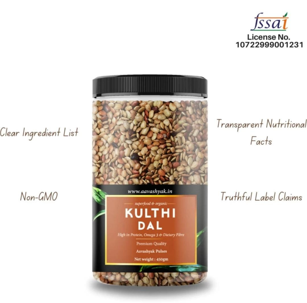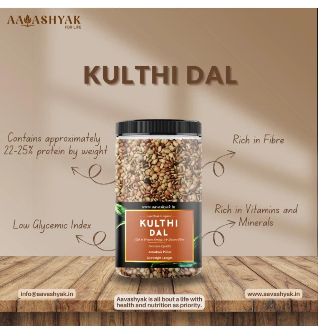 Aavashyak Organic Horse Gram (Whole) (Kulthi Dal, Kollu Paruppu) (450 g)" is a premium-quality, whole horse gram product offered by Aavashyak, a trusted brand in the organic food market. This 450-gram pack contains unprocessed, whole horse gram beans, also known as Kulthi Dal or Kollu Paruppu, sourced from certified organic farms. Horse gram is a nutrient-dense legume rich in protein, dietary fiber, and various vitamins and minerals, making it a popular choice for health-conscious individuals and those seeking natural, wholesome ingredients.